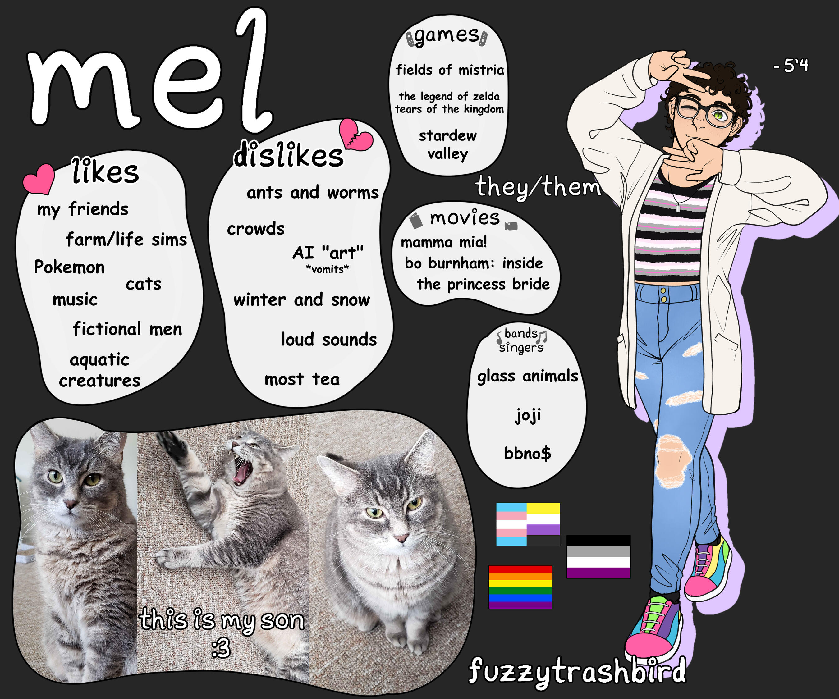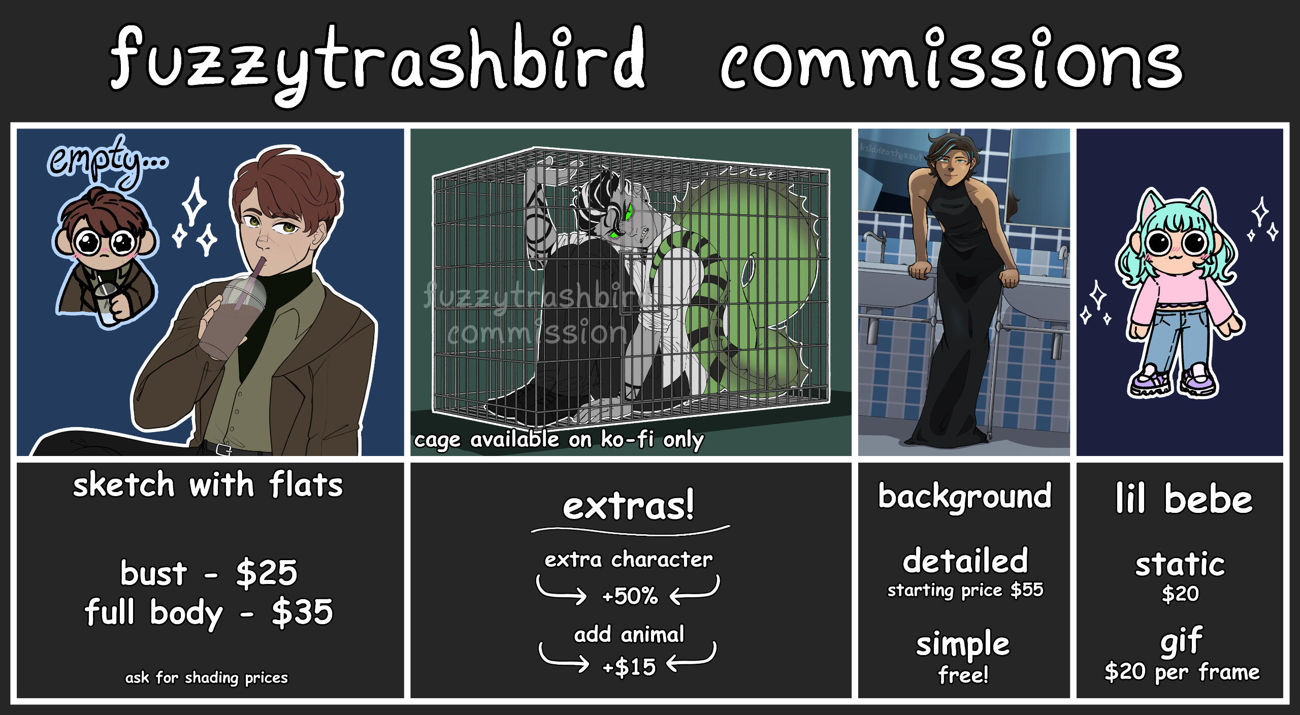 note: commissions/art trades are not done in order of who ordered first. they're done in order of what i have energy for and feel like i can work on first. this does mean i bounce around from drawing to drawing a bit.art trades are ONLY done with friends or if i initiate